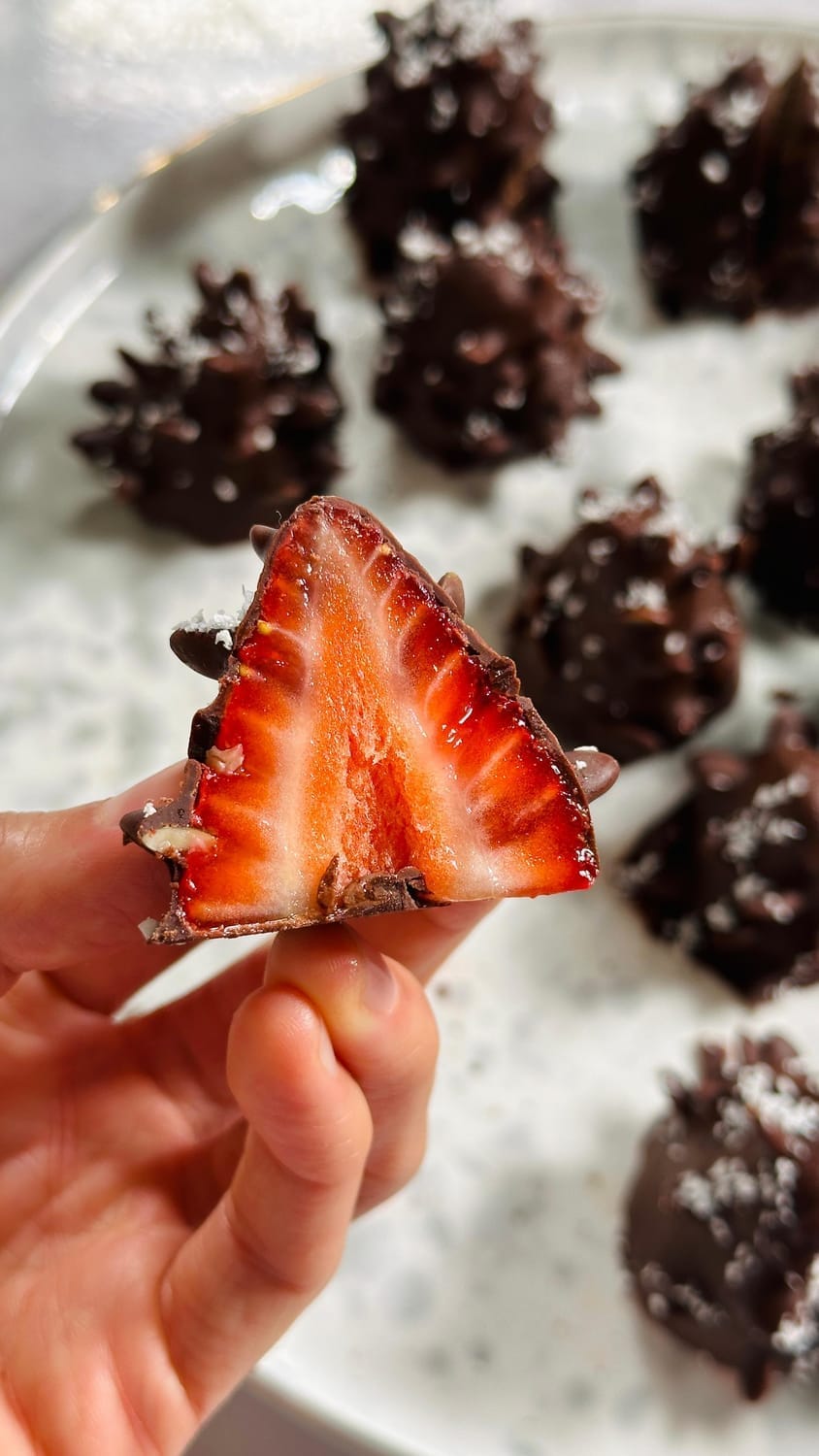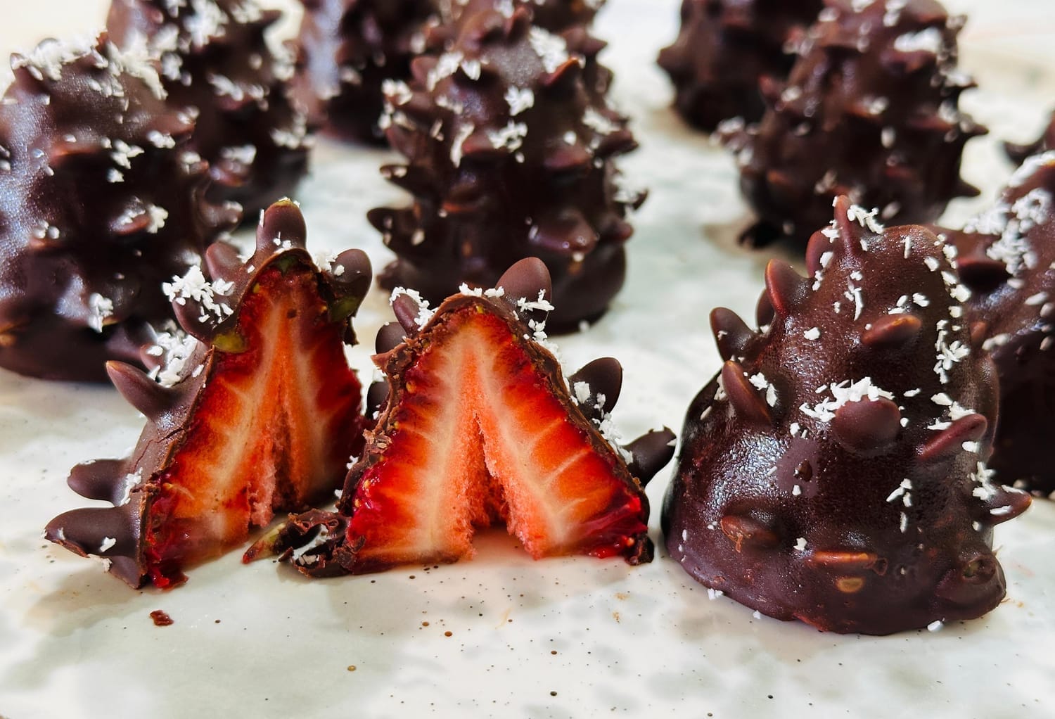 Comienza con las frutillas: pon una frutilla sobre una cuchara y con otra cuchara agrega encima la salsa de chocolate derretida. Debe quedar completamente cubierta de chocolate, incluyendo las semillas. Luego con cuidado, pon la frutilla bañada en chocolate sobre una lámina o papel antiadherente. Repetir con cada frutilla. Al terminar, llévalos al refrigerador.